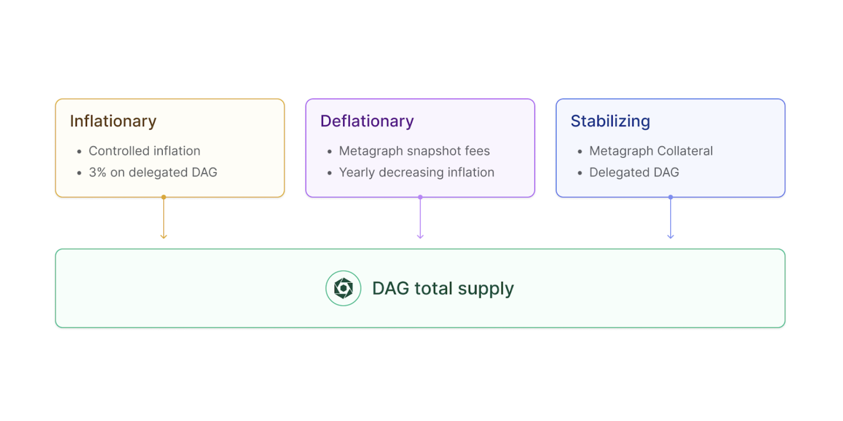* **New $DAG is minted** at a controlled rate to reward network participants.